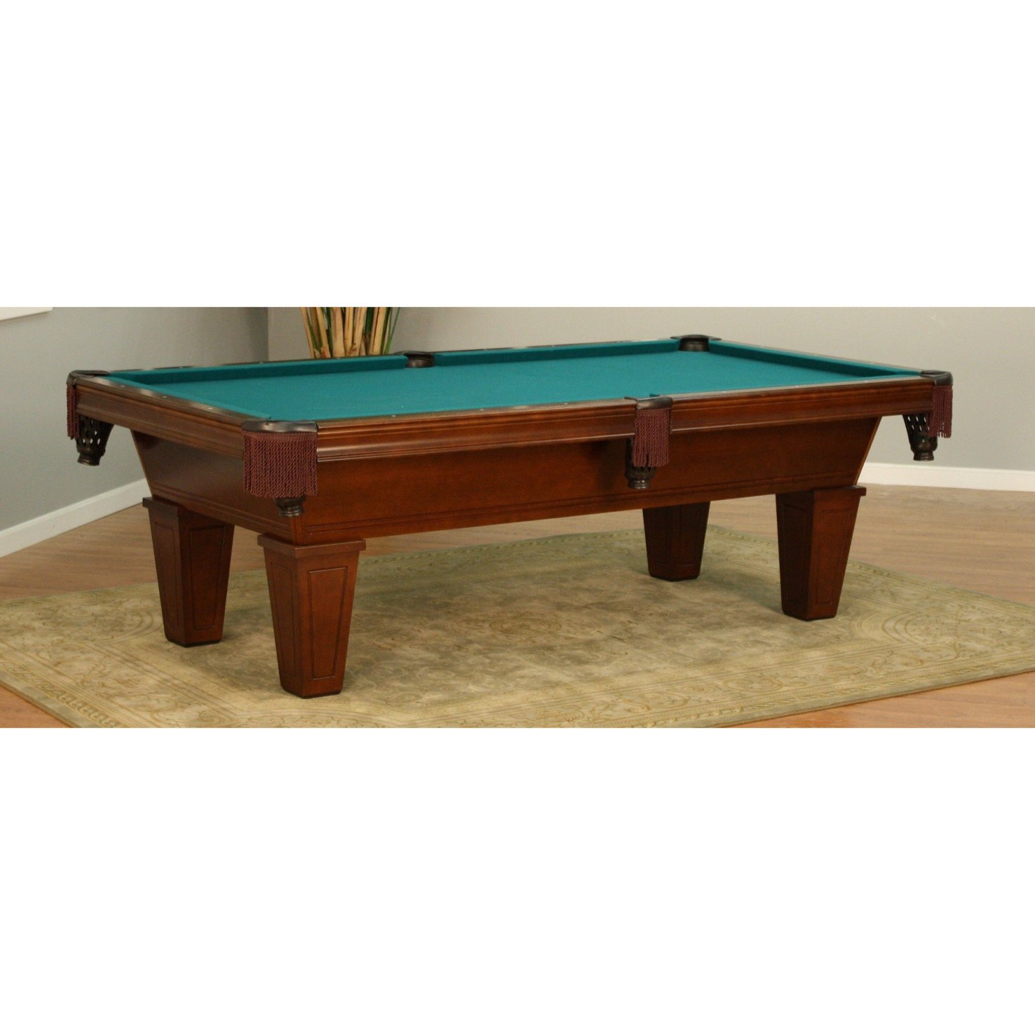 The Camden has decorative blinds, traditional style claw-and-ball feet, and sophisticated ornamental details. This billiard table features white molded pearlized diamond rail sights, warm Navajo finish, and brown leather pockets.