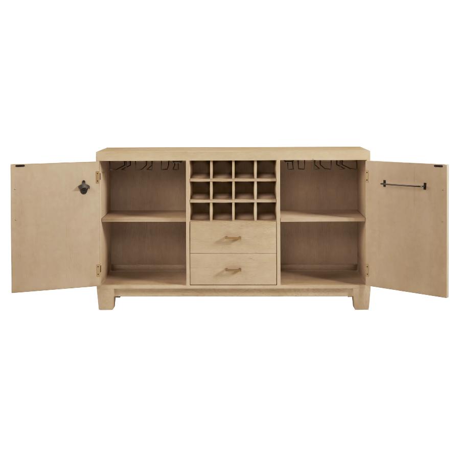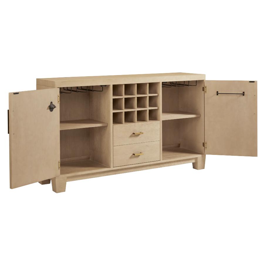Use in an entry way or in lieu of a wine cabinet or full-sized bar, this piece has plenty of storage and clever elements. Featuring a large area for mixing cocktails, grided wine bottle storage, glass stemware holders, a towel hanging rack, and a hidden bottle opener sure to please.