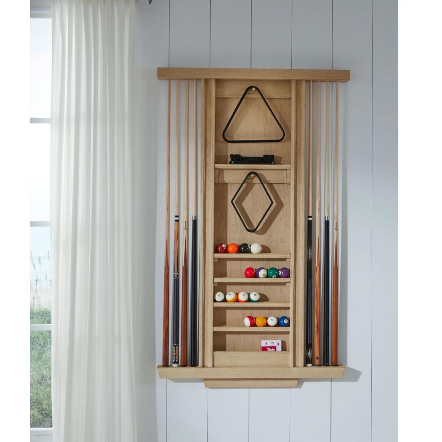 The Port Royal Cue Rack holds up to 8 cues while simultaneously displaying racks, balls, brushes, and chalk with plenty of room for additional billiard accessories.