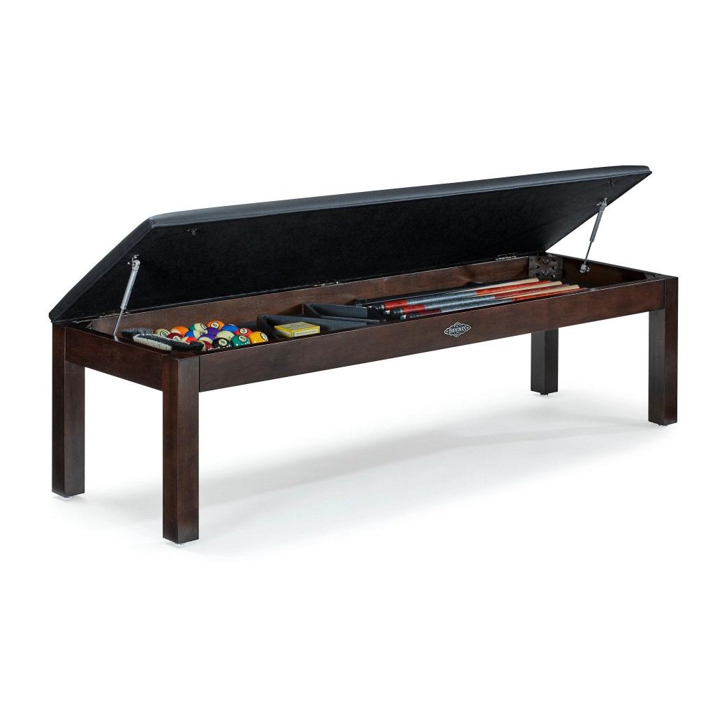 The Centennial Storage Bench features a modern design and is designed to match your favorite billiard table and furniture. Materials include solid hardwood, plywood and wood product.  Features include storage for all accessories included in our Centennial Play Package, and gas assist hinges for easy open and close. The Storage Bench seats 3 comfortably at 75.25″ long. Available in rustic grey, rustic dark brown, and espresso finishes.