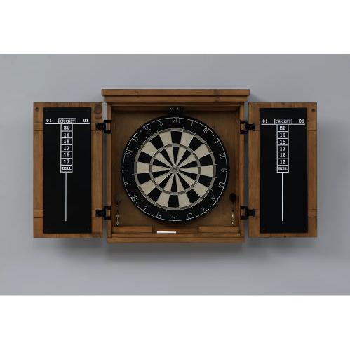 Constructed of hardwood and hardwood veneers with antique bronze hinges and cabinet door knobs. Offered in black wire brush, espresso, rustic dark brown, and rustic grey finishes. Cabinet dimensions are 37″ x 30.25″ x 7.25″. Dartboard and darts not included.