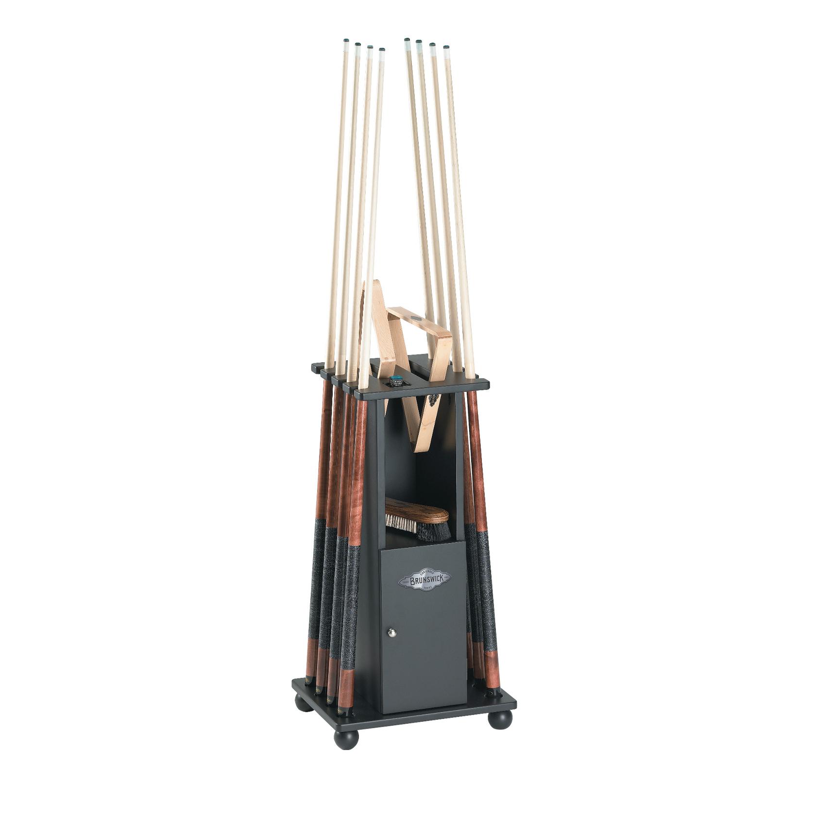 The free-standing Heritage Floor Cue Rack is the perfect solution for your billiard storage needs. Designed to hold up to eight cues, two ball racks, chalk, table brush, and additional accessories. Available in black, chestnut, espresso, tuscana, driftwood and rustic grey finishes. Some assembly required.