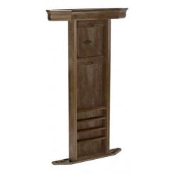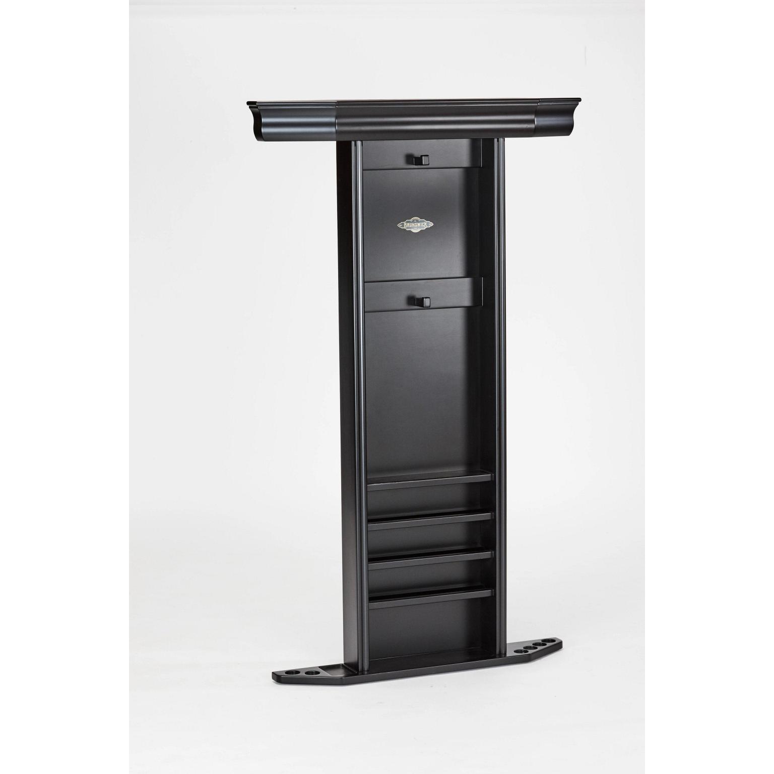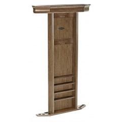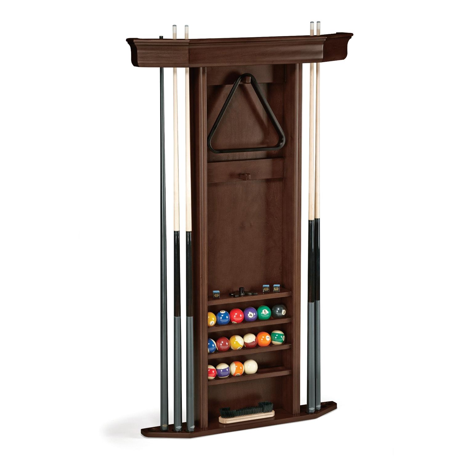 Beautiful closed-back transitional wall rack. Louis-Philippe style angled header panel. Features the standard Brunswick wall mounting system. Some assembly required. Holds all the contents of a play package (sold separately): Up to eight cues, 8-ball rack, 9-ball rack, set of billiard balls, brush and chalk.