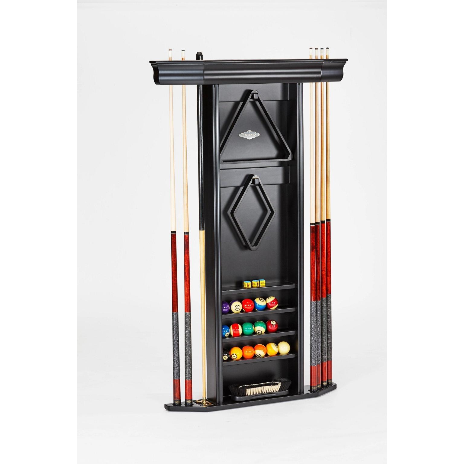 - Holds all the contents of a play package: Up to eight cues, 8-ball rack, 9-ball rack, set of billiard balls, brush and chalk