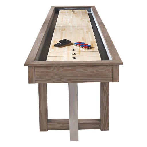 Comes with all shuffleboard accessories: 4 Blue pucks, 4 Red pucks, 2 ABS abacus scoring units, 1 table brush and 1 can of table wax. Available in 9 and 12-ft sizes. 180-day limited warranty.