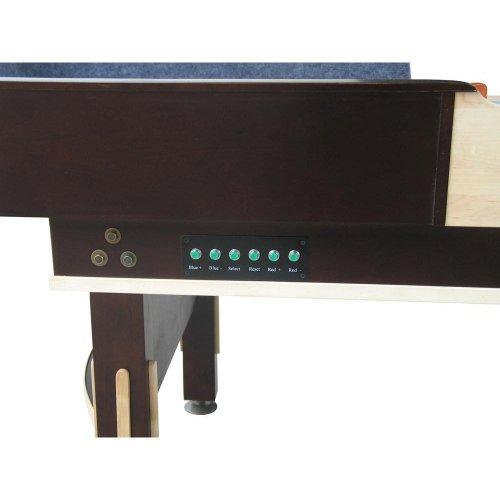 This high quality game table features a 3” thick playing surface constructed of select kiln-dried Hard Rock Maple and topped with a Polymer Finish (lifetime warranty). This is the same finish insisted upon by the Professionals in tournament play. And to help keep the playing surface true, climatic adjusters are included. The cradle is constructed of solid wood with your choice of stain color. Sorry bar stools and beer are not included.