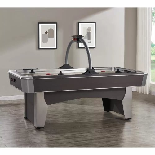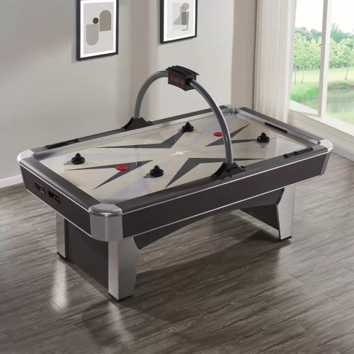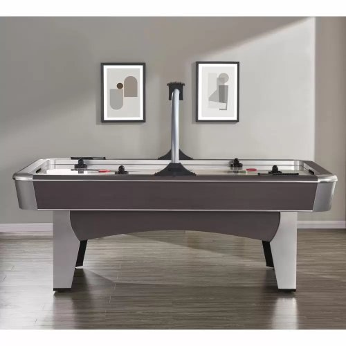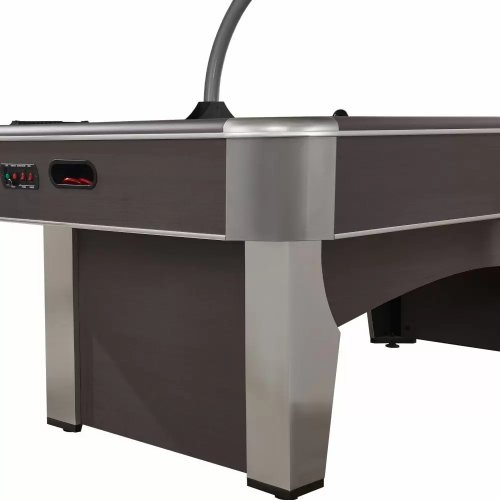 The Telluride Air Hockey Table in rustic brown finish warms up any décor with its modern country style and decorative metal accents. Sturdy wooden legs supported by a unique metal crossbar lend strength for bolder competition.