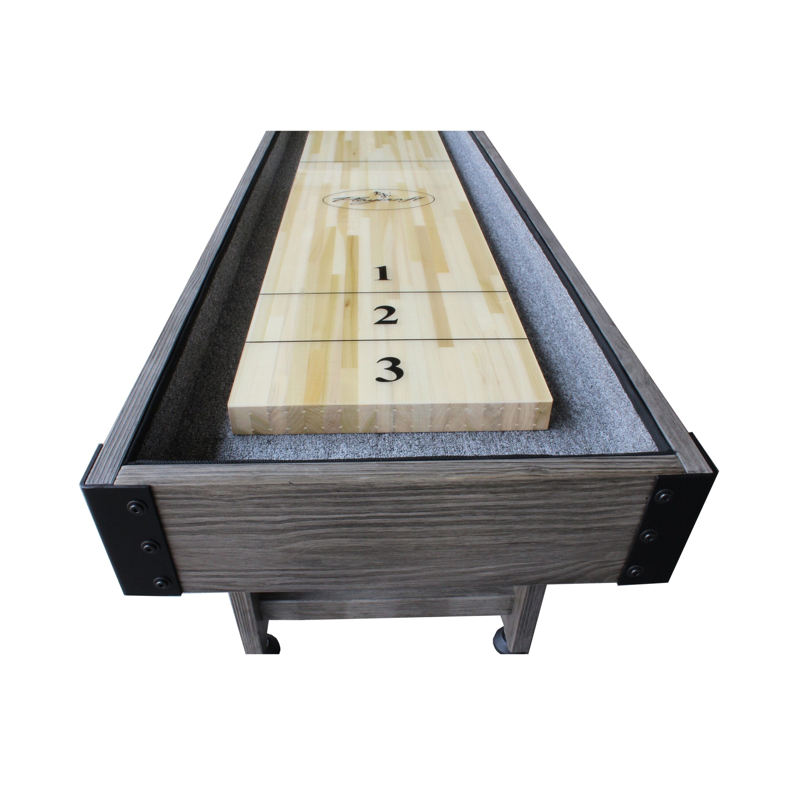 When comparing manufacturers, make sure to look for a 1.75″ thick playfield, as the extra depth looks better in the cradle and feels better on the hand when setting a puck. The shuffleboard playfield logo style and/or position may vary.