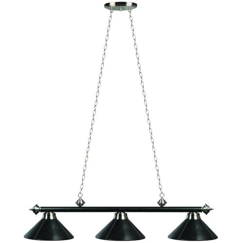 Build a true game room or entertainment space around the classic style of this 3-light metal billiards light fixture. Delivering ample lighting to your pool table or bar, this fixture features three metal shades with a black finish. A metal pole connects the three lights and delivers stylish flair with stainless caps that add depth and dimensionality. This lighting fixture suspends from a pair of chains.
