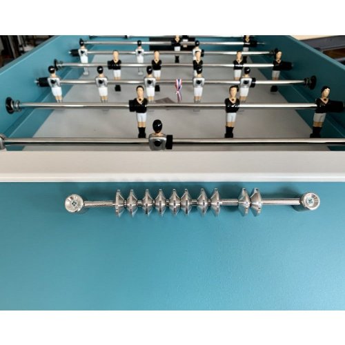 Please Note: This is the new 2022 model, featuring a traditional Gerflex linoleum playing surface in light aqua (without lines). It no longer comes with the green/glass playfield but offers the same exceptional quality found in all other René Pierre foosball tables.