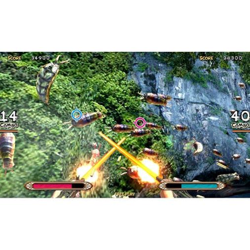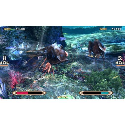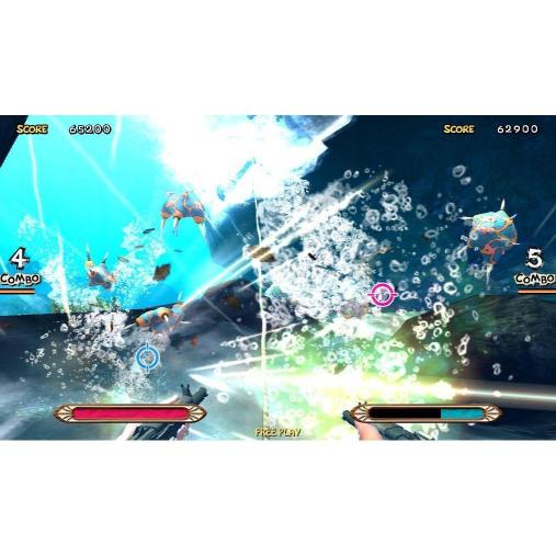 The cabinet looks stunning with LED-lit edge lighting and a fully lit header. The large two 50” vertical screens encourages spectators to watch the action while players enjoy the immersive VR experience. The air canon jolts players when they get hit by the enemy adding a tactile element to the experience.
