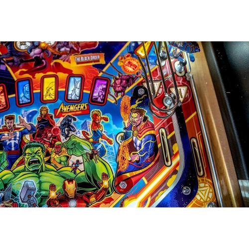The Premium and Limited Edition models feature an interactive Dr. Strange motorized pop-up disc scoop, transporting pinballs into an underground Portal, a visible subway capable of holding and staging up to 3 balls through custom playfield windows accentuated with dynamic RGB lighting effects. These models also include a custom sculpted Thanos Infinity Gauntlet integrated with atmospheric light-up gems, a Captain Marvel inverse gravity custom wireform ramp, and a Pym Laboratories vertical up-kicker.