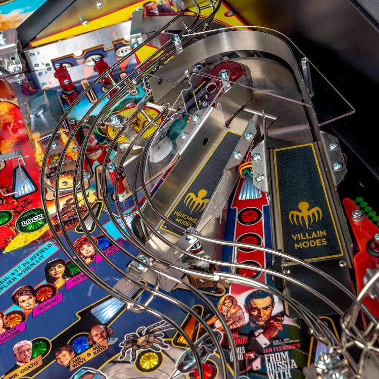 - High-speed stainless steel combination ramp with a side entry that feeds the chrome wireform ramp return and can activate the in-lane Up-Post, preparing for the start of Henchmen Modes