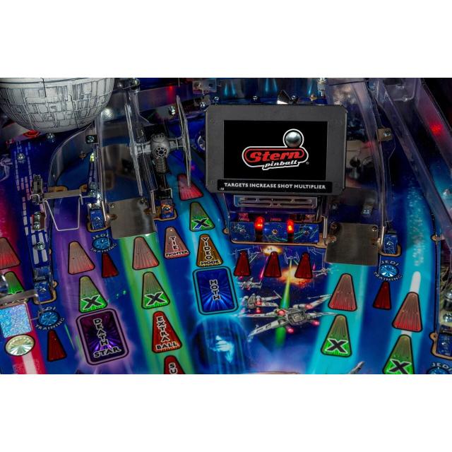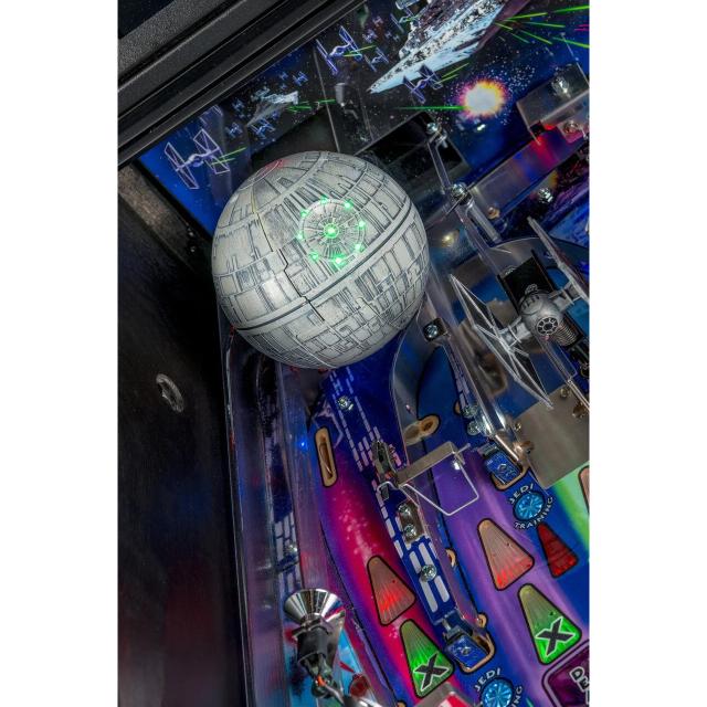 The Star Wars LE and Premium models have even more features and devices, including a Hyperdrive magnetic ball accelerator, all-metal ramps, and a Death Star that explodes to release balls locked for multiball. The LED-lit Millennium Falcon is available as an accessory for the Pro. Each version has a distinct hand-drawn Star Wars art package, with the LE featuring themed Millennium Falcon art and laser-cut side armor, and the Premium showcasing The Dark Side.